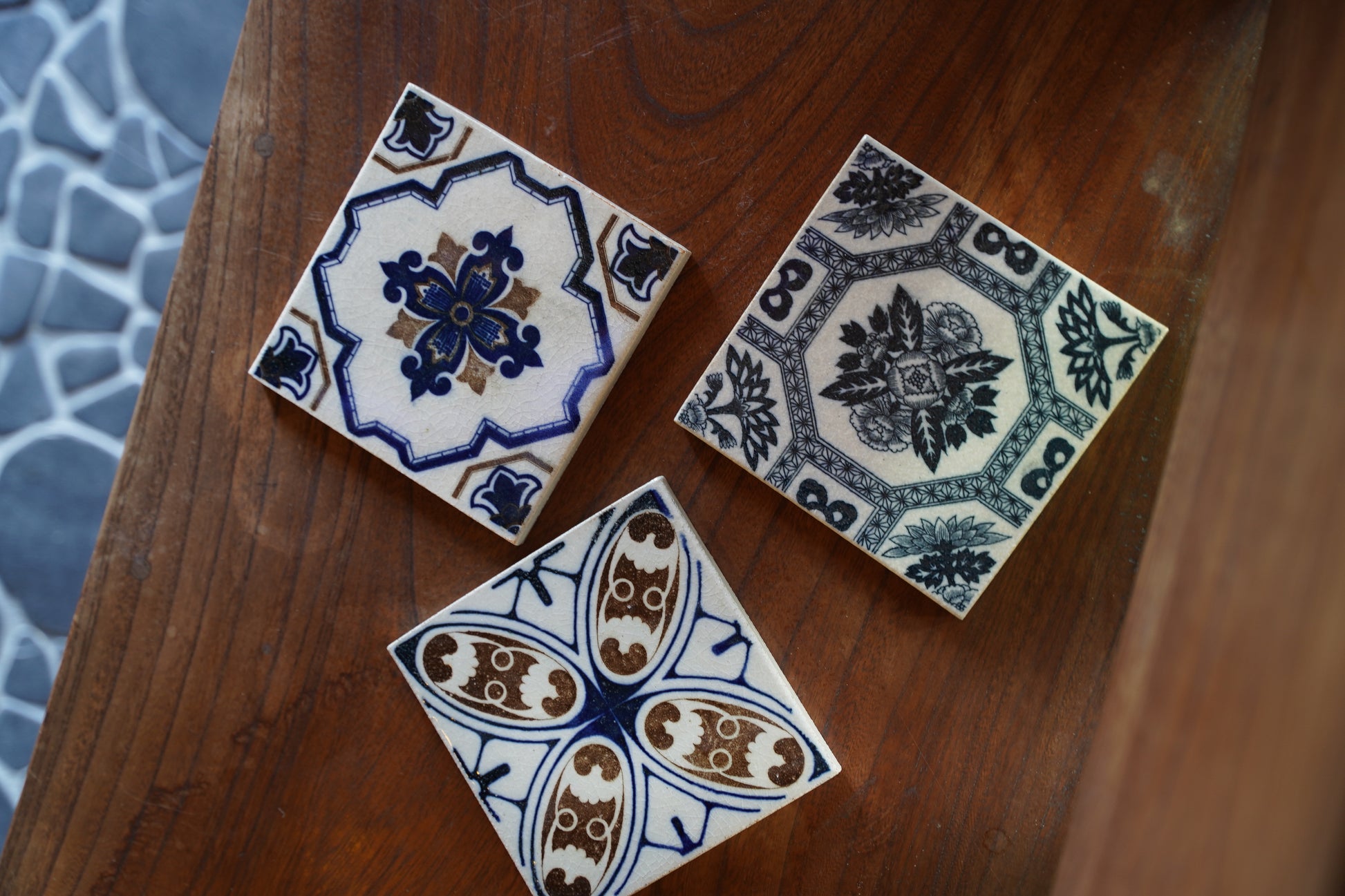 伝統的な日本の紋様に加え、植物や花柄、複雑な幾何学模様などの装飾が施されたイギリスのヴィクトリアン・タイル調のデザインが多く採用されました。